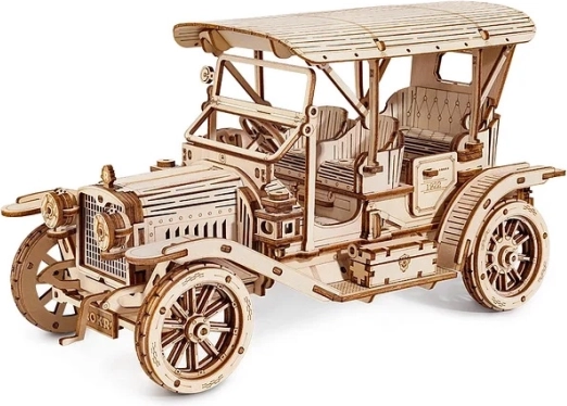 Den træbaserede 3D puslespilmodel af en historisk bil fra RoboTime er en trokopi af vintage køretøjer fra messingens æra, inspireret af køretøjer fra 1910'erne. Aerodynamisk skærm og elegante linjer giver et udseende, der minder om hestevogne, sammen med autentiske detaljer som gearstang og komfortable sæder – alt dette bidrager til modellens unikhed.