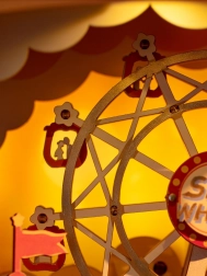 Hvert enkelt detalje er gennemtænkt for at fremkalde karnevalets atmosfære. Pariserhjulet og forlystelsesparken stråler i mange farver.