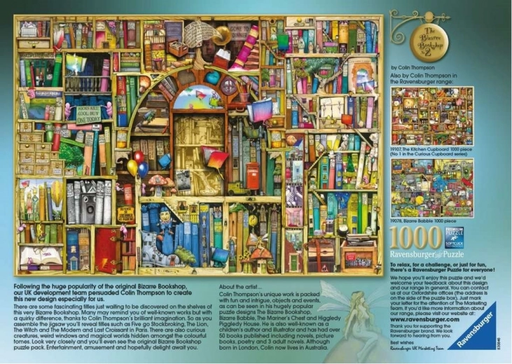 Træd ind i fantasiens verden med et originalt puslespil på 1000 brikker inspireret af Colin Thompsons værk. Her venter farverige bogreoler, sjove hentydninger til kendte titler og masser af skjulte detaljer, som du opdager undervejs i lægningen. Den høje kvalitet med lærredsagtig, refleksfri overflade og præcise brikker sikrer en jævn og behagelig oplevelse fra start til slut.