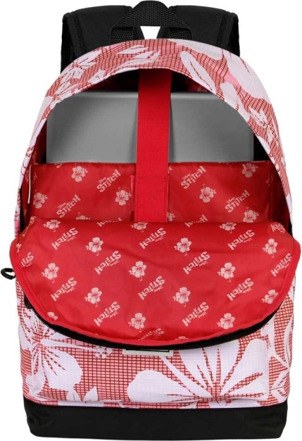 Let byrygsæk med motiv af Lilo & Stitch i rød farve, der glæder med daglig funktionalitet. Den tilbyder ét rum med indersidefor og lomme til elektroniske enheder, en forlomme til småting, justerbare polstrede skulderstropper for komfort og en bageste stropp til kuffert for nem rejse. Det slidstærke polyestermateriale sikrer lang levetid.