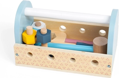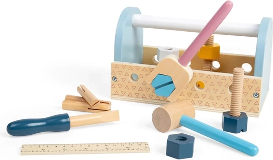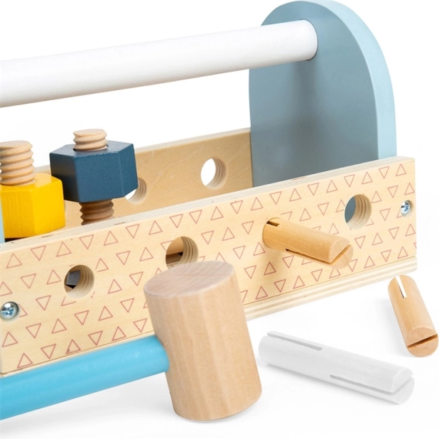 Trætransportkassen med værktøj er det ideelle valg til de første reparations-eventyr. Børn kan hamre, spænde og måle og udvikler hånd-øje-koordination, tålmodighed og ordforråd gennem legen. De kompakte mål og det praktiske håndtag gør sættet let at tage med.