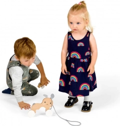 Fire solide hjul med geometrisk mønster ruller jævnt på plane overflader, mens den grå træksnor ligger godt selv i små hænder. Legetøjet hjælper med at udvikle smidighed, balance og koordinationsevner og fremmer aktiv bevægelse og fantasi.