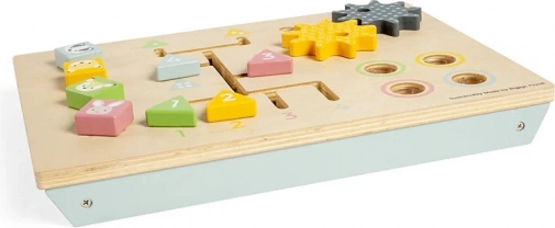 Bordet rummer en række aktiviteter, der støtter den tidlige udvikling: børn kan banke pinde i med en træhammer, prøve at spænde gevindskruer med dyrehoveder, dreje tandhjul i træ eller lægge nummererede trekanter i de rigtige huller. Legetøjet er fremstillet af etisk indkøbt FSC®-træ og opfylder de gældende europæiske sikkerhedsstandarder.