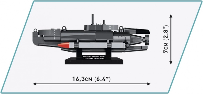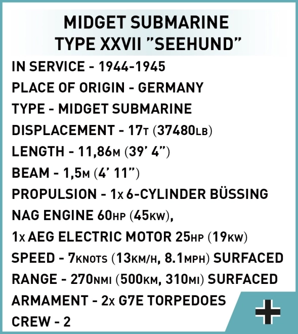 Seehund (Type XXVII B) var en tysk miniubåd fra 1944, betjent af en tosædet besætning og indsat i den afsluttende fase af Anden Verdenskrig. Dette licenserede samlersæt er skabt i samarbejde med Deutsches Marinemuseum, hvor et af de få bevarede eksemplarer er udstillet. COBI-byggesættet gengiver trofast originalens karakteristiske linjer i den optimerede skala 1:72.