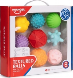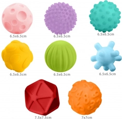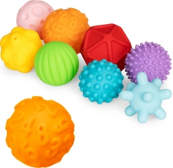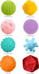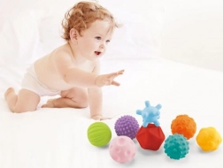 Dette farverige sæt giver babyer og tumlinger masser af oplevelser – hver bold har en anderledes tekstureret overflade, størrelse og farve, hvilket hjælper børn med naturligt at udvikle greb, hånd–øje-koordination og formopfattelse. Den bløde silikone er behagelig at røre ved, og boldene er lette at klemme for små hænder.