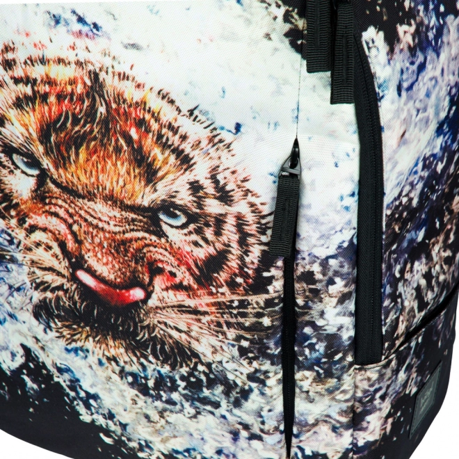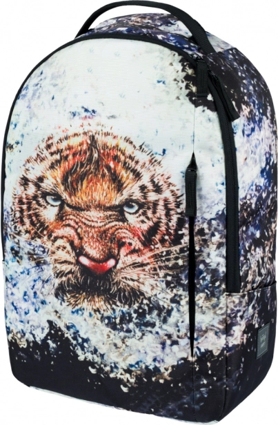 Stilfuld by-rygsæk af 100% genanvendt, vandafvisende materiale med et markant tigermotiv af kunstneren Lukero. Den byder på ergonomisk formet ryg, justerbare stropper, indvendig lomme til 15" laptop samt praktiske for- og top-lynlåslommer. Takket være lav vægt på 500 g, volumen på 18 l og bæreevne på 7 kg er den ideel til hverdagsbrug.