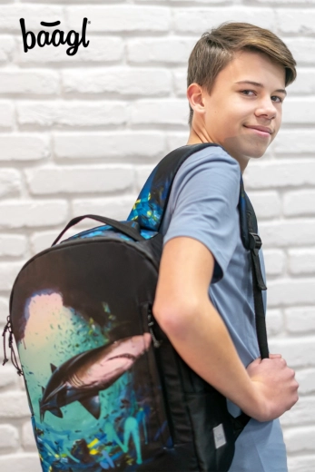 Oplev komfort og bæredygtig stil med rygsækken BAAGL eARTh – Shark by LUKERO. Takket være det vandafvisende, 100% genanvendte materiale forbliver dit udstyr sikkert i al slags vejr, mens den markante grafik med hajmotiv fanger blikket med det samme.
