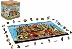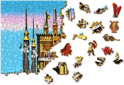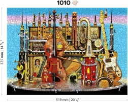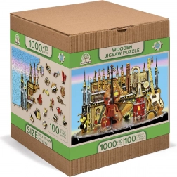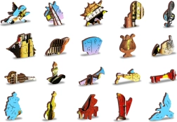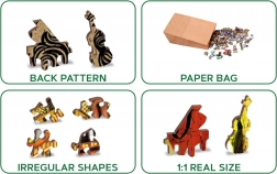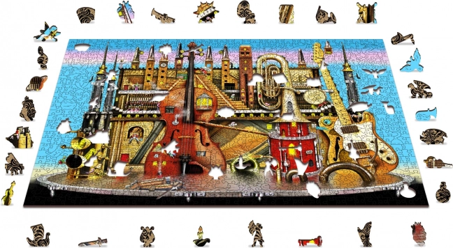 Dette førsteklasses træpuslespil præsenterer et originalt motiv af en musikby med instrumenter og tårne, som vil begejstre både voksne og nysgerrige børn. Brikkerne er laserskåret af robust HDF-plade (3–4 mm), har glatte kanter uden splinter, og en del af dem har specialformer som dyr, bygninger og genstande. Det gør lægningen mere krævende, men samtidig utrolig underholdende og visuelt imponerende.