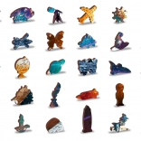 - med unikt formede brikker, der forestiller kendte bygninger, genstande eller dyr efter motivets tema
