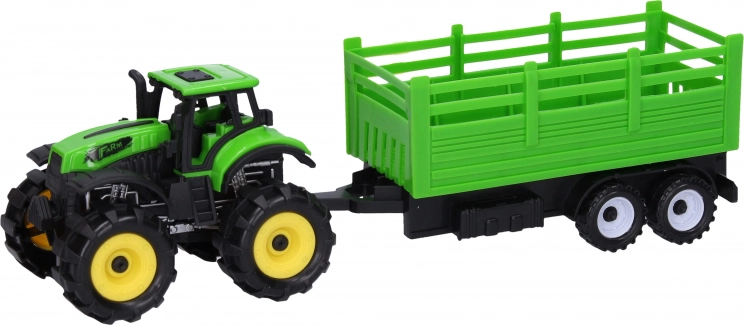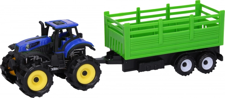 Traktor med anhænger til børn, med dimensionerne 27,5x7x7,5 cm og svinghjulstræk. Tilgængelig i to farver: blå, grøn.