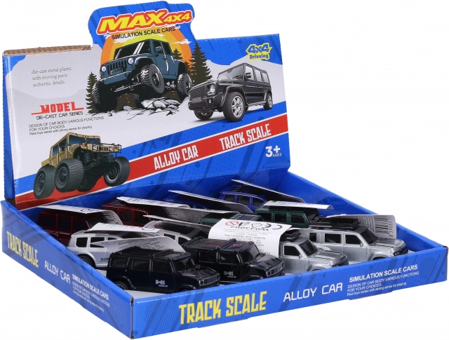 Metal terrænbil 7,6 cm med pull-back, 6 farver. Robust udførelse, ideel til leg og samling. Leveres i displayboks med 12 stk.