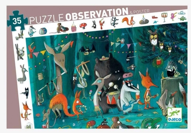Oplev musikkens magi med DJECOs børnepuzzle – Skovorkester. Puslespillet med 35 solide brikker danner et stort billede på 61 × 38 cm og byder på en sjov findespilsramme med detaljer. Plakat medfølger. Ideel til børn fra 3 år, som under samling træner finmotorik, koncentration og kendskab til musikinstrumenter. Store og robuste brikker, søg- og find-ramme med objekter og plakat for nemmere samling garanterer timevis af kreativ underholdning.