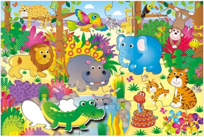 Gør jer klar til et jungleeventyr! GALT gulvpuslespil vil begejstre alle små opdagelsesrejsende – her venter junglens konge løven, en krokodille, en elefant, en tigerfamilie og giraffer. Takket være de store og holdbare brikker er det nemt og sjovt at lægge, samtidig med at det styrker finmotorik, logisk tænkning og tålmodighed.