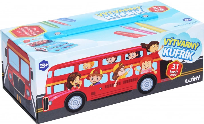Alt, hvad unge kunstnere behøver, samlet i en praktisk kuffert med busmotiv: 31 dele kreative materialer – farveblyanter, vokskridt, tuscher, akvarelfarver, viskelæder, blyantspidser, blyant, pensel, svamp og lille notesbog. Ideel til rejser og hjemmet og som en fantastisk gave til kreative børn.