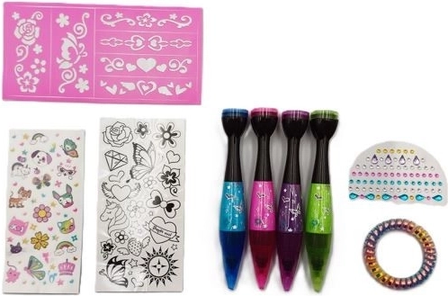 Skab dine egne midlertidige tatoveringer og unik kropsudsmykning med Tattoo Studio-sættet. Sættet indeholder penne med specialspidser og stempler til hurtige motiver samt skabeloner til præcise former. Ideelt til fester, festivaler og børnefødselsdage – nemt at bruge, kreativ sjov og effektfulde resultater på ingen tid.