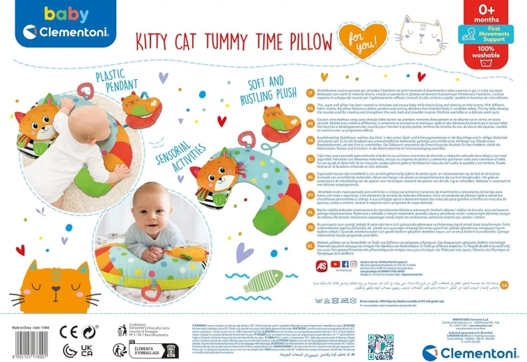 De varierede teksturer stimulerer berøringssansen, det knitrene killinge-element og katteknurhårene vækker nysgerrighed og koordination, mens det plastiske hjerte på stroppen fungerer som en praktisk bidering under tandfrembrud. Puden er let at vedligeholde – den kan vaskes på skåneprogram.