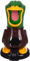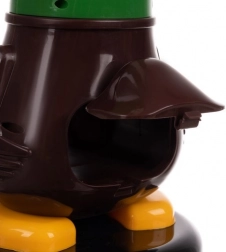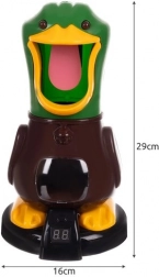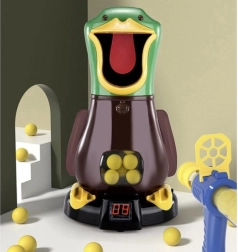 Et træf i andens åbne næb leder kuglen ned i maven, og den store LCD viser straks det tillagte point. Et kvæk-lyd bekræfter succes.