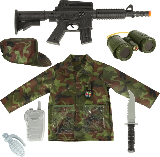 Kvalitets camouflagejakke og kasket sikrer det perfekte militære udseende. Velegnet til både udendørs og indendørs spil.