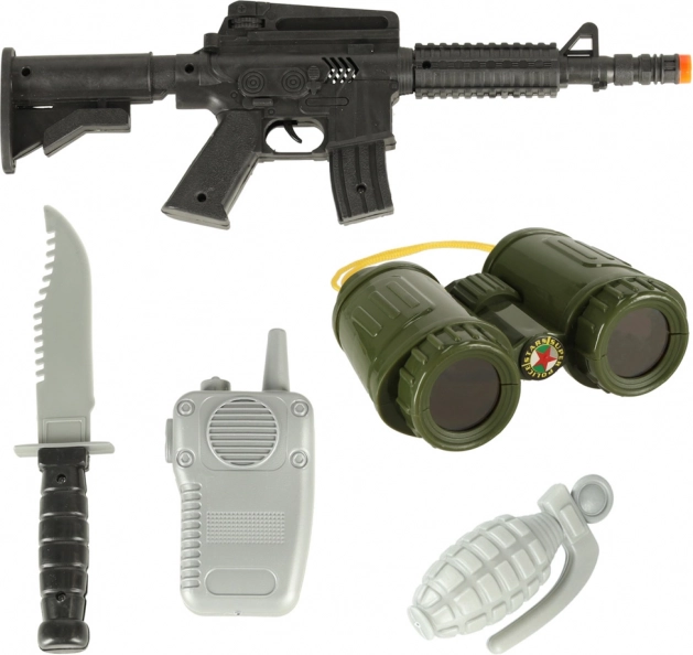 Sættet indeholder plastiktilbehør som våben, kniv, walkie-talkie og mere, til realistisk leg og udvikling af fantasien.