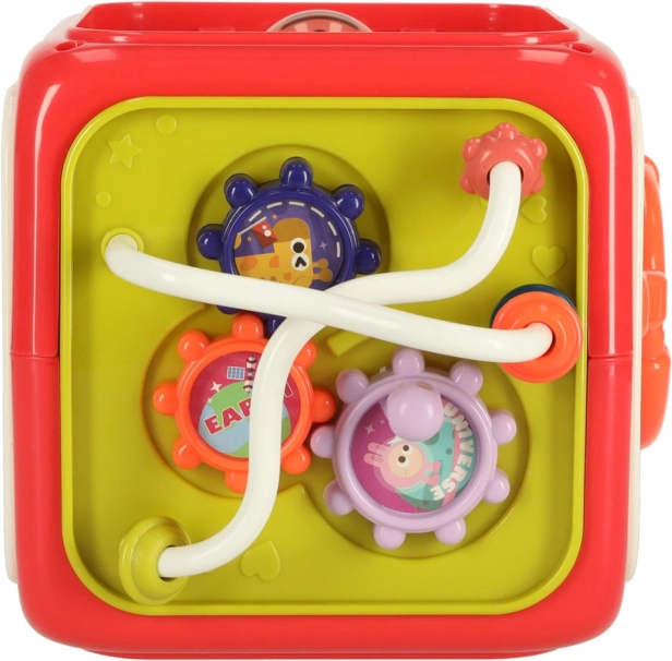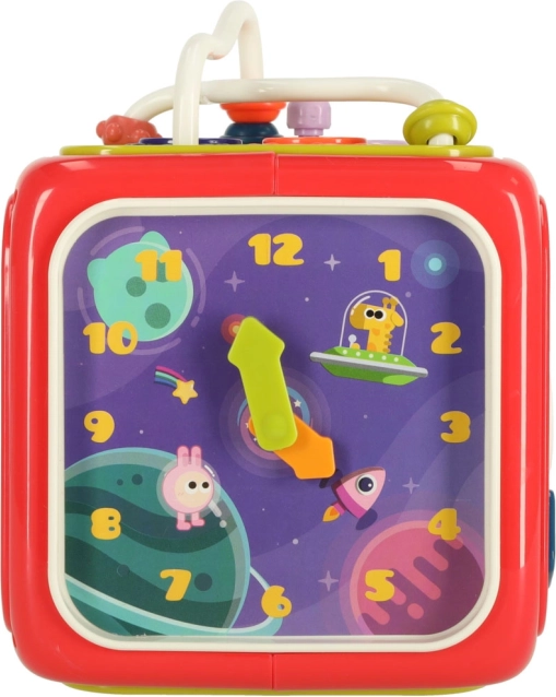 Farverig og brugervenlig, denne terning fanger børns opmærksomhed med bevægelige visere og interaktive elementer.