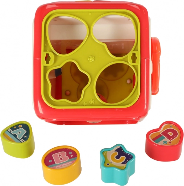 - Består af en terning og fire blokke, der fremmer genkendelse af former og farver.