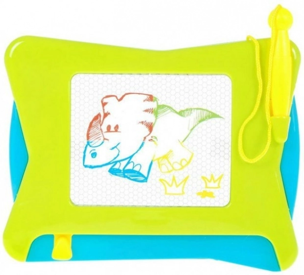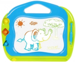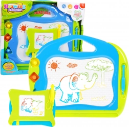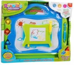 Dette sæt indeholder en stor magnetisk tavle med hvid tegneflade og indbygget farvet baggrund (rød, grøn, blå, gul) samt en mindre rejsetavle gratis. Med den medfølgende stylus og tre stempler (cirkel, firkant, trekant) kan børn skabe farverige billeder, øve former og udvikle kreativiteten.