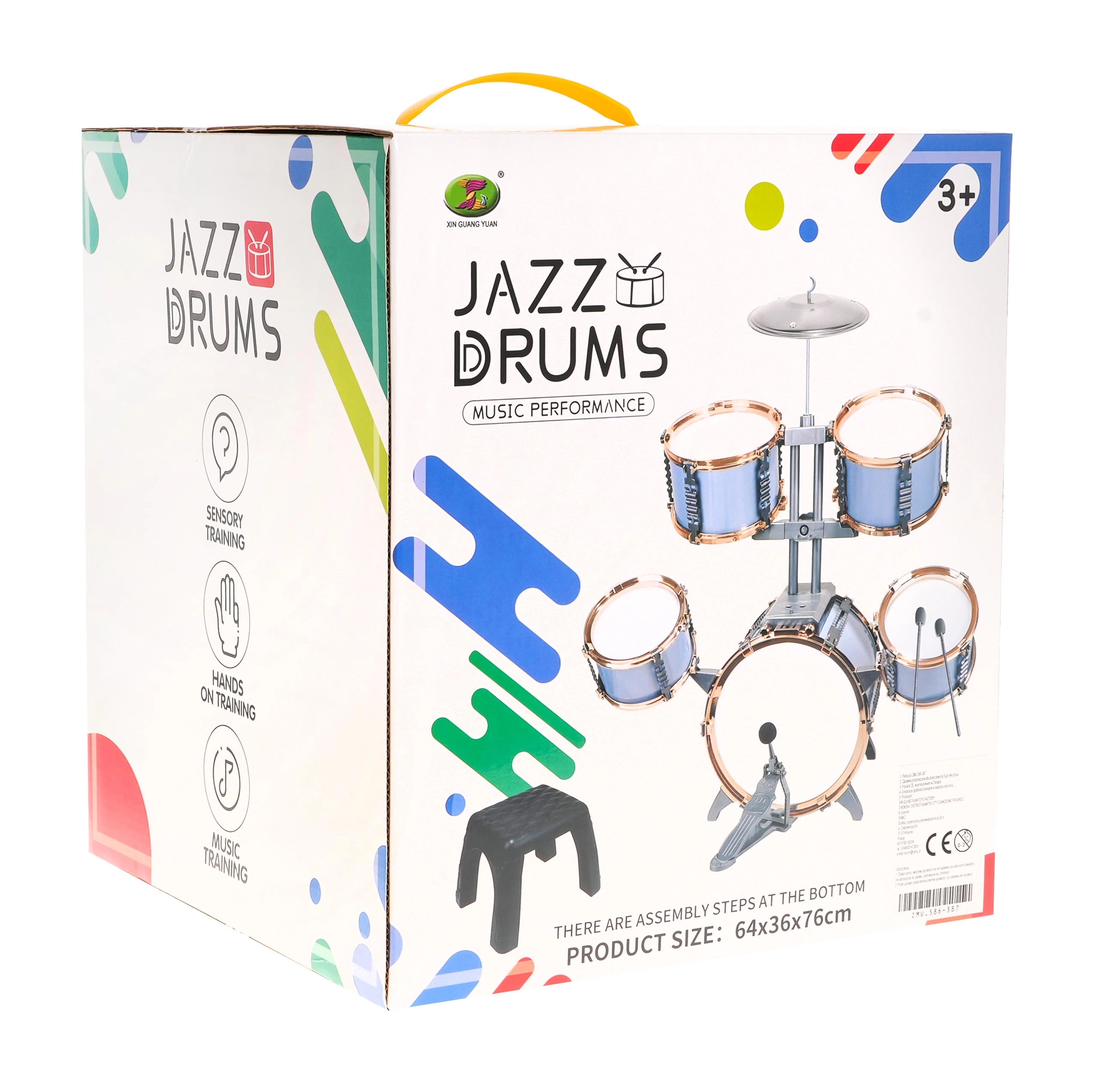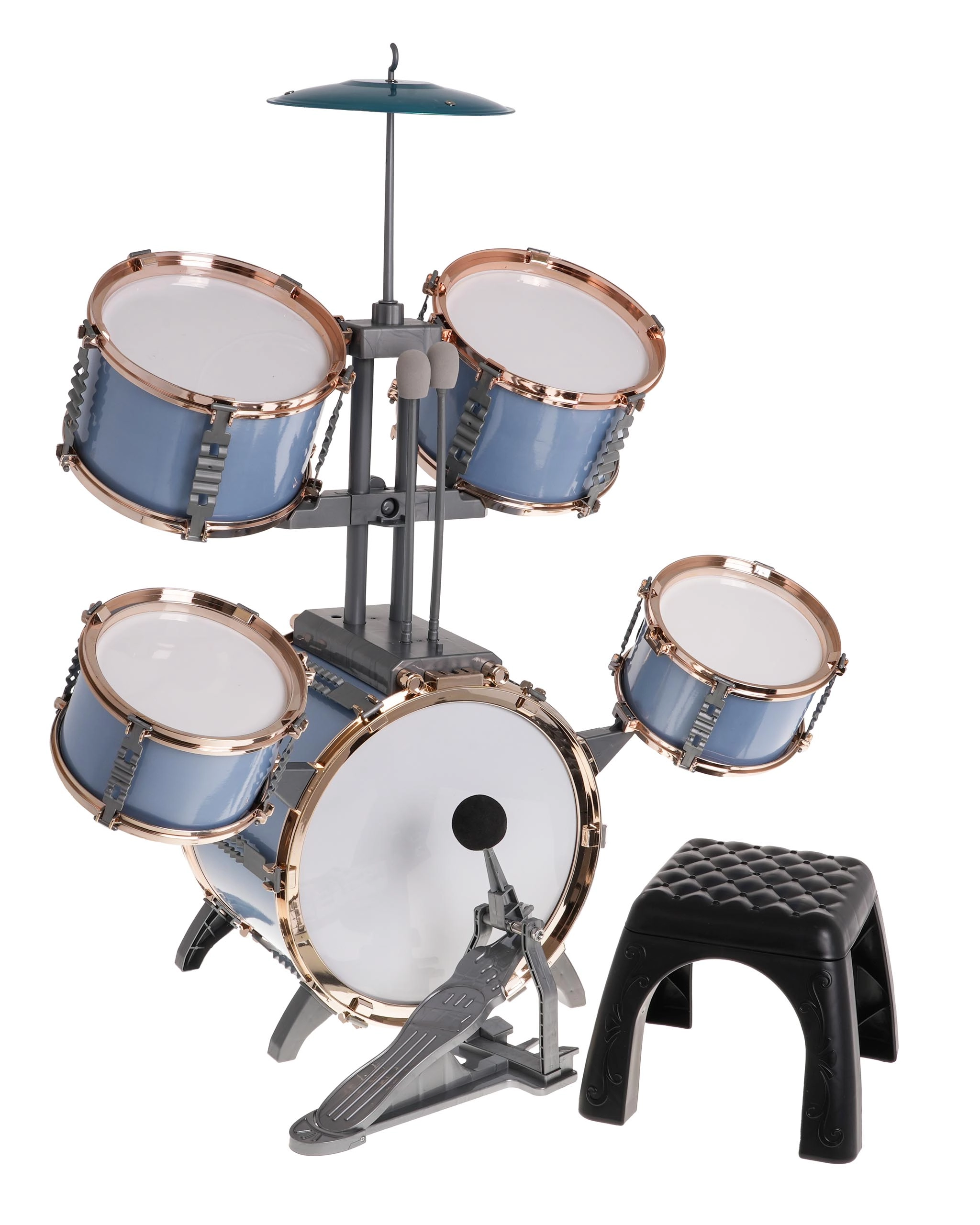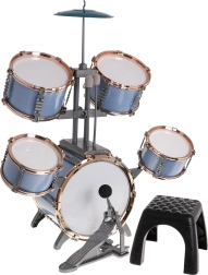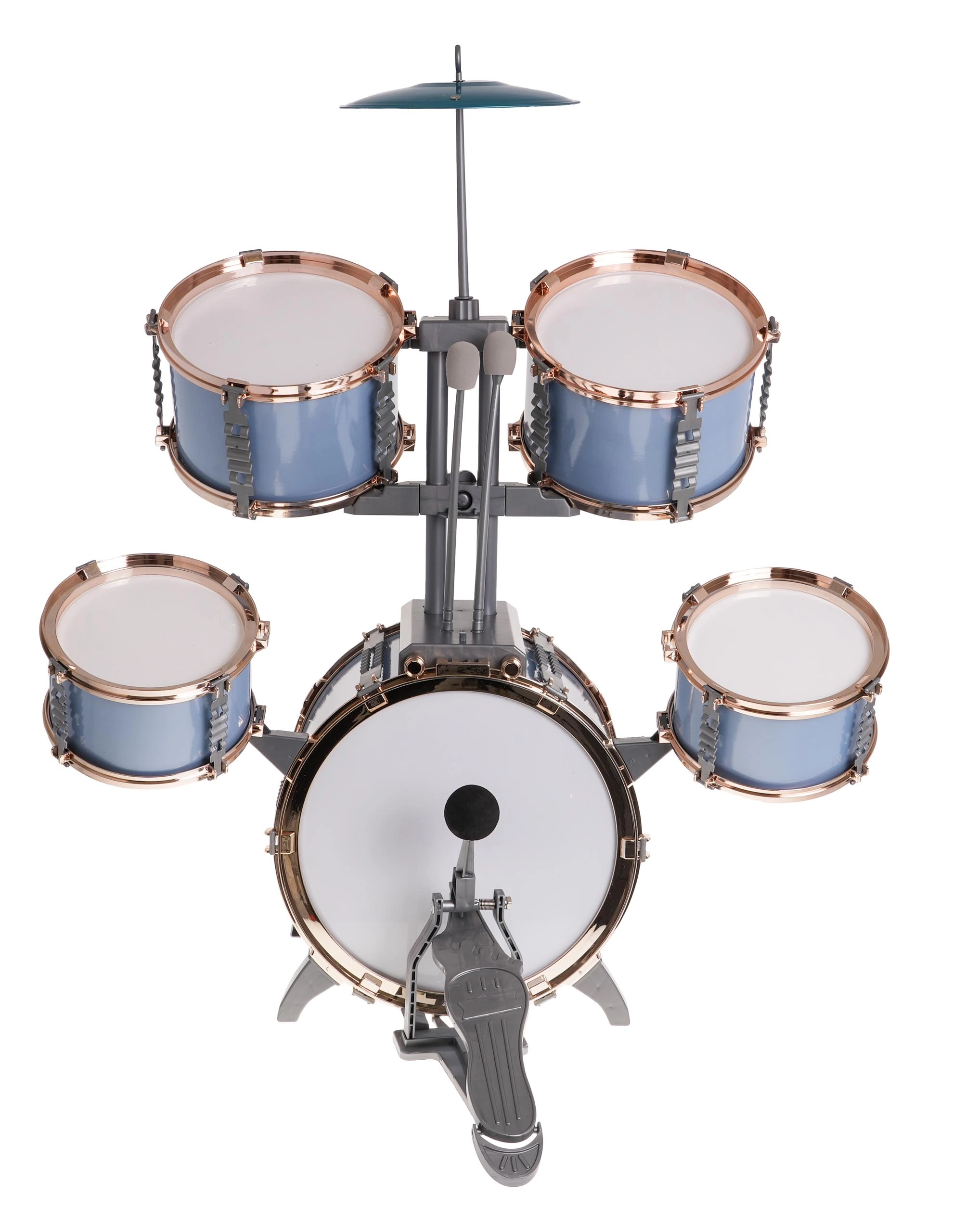 Stort børne-trommesæt til små musikere fra 3 år med 5 trommer, metalsymbal, stortrommepedal, 2 trommestikker og skammel. Stabil plastkonstruktion, realistisk look og nem montering fremmer rytmiske færdigheder og kreativitet hos børn.