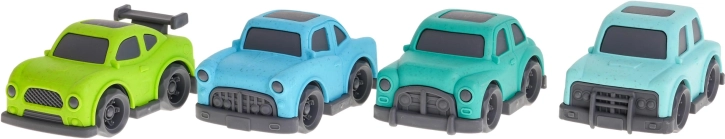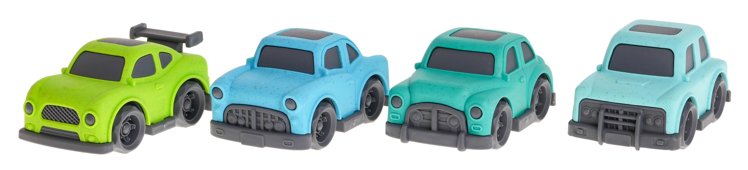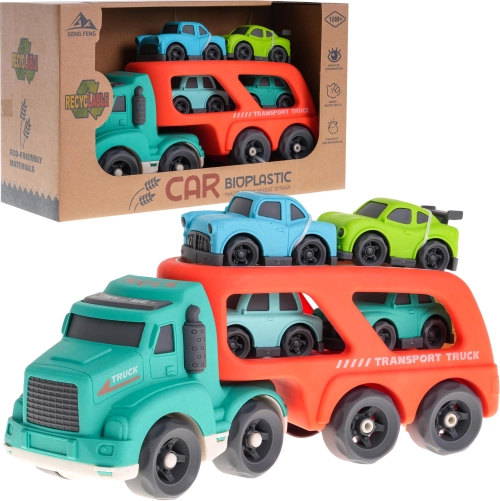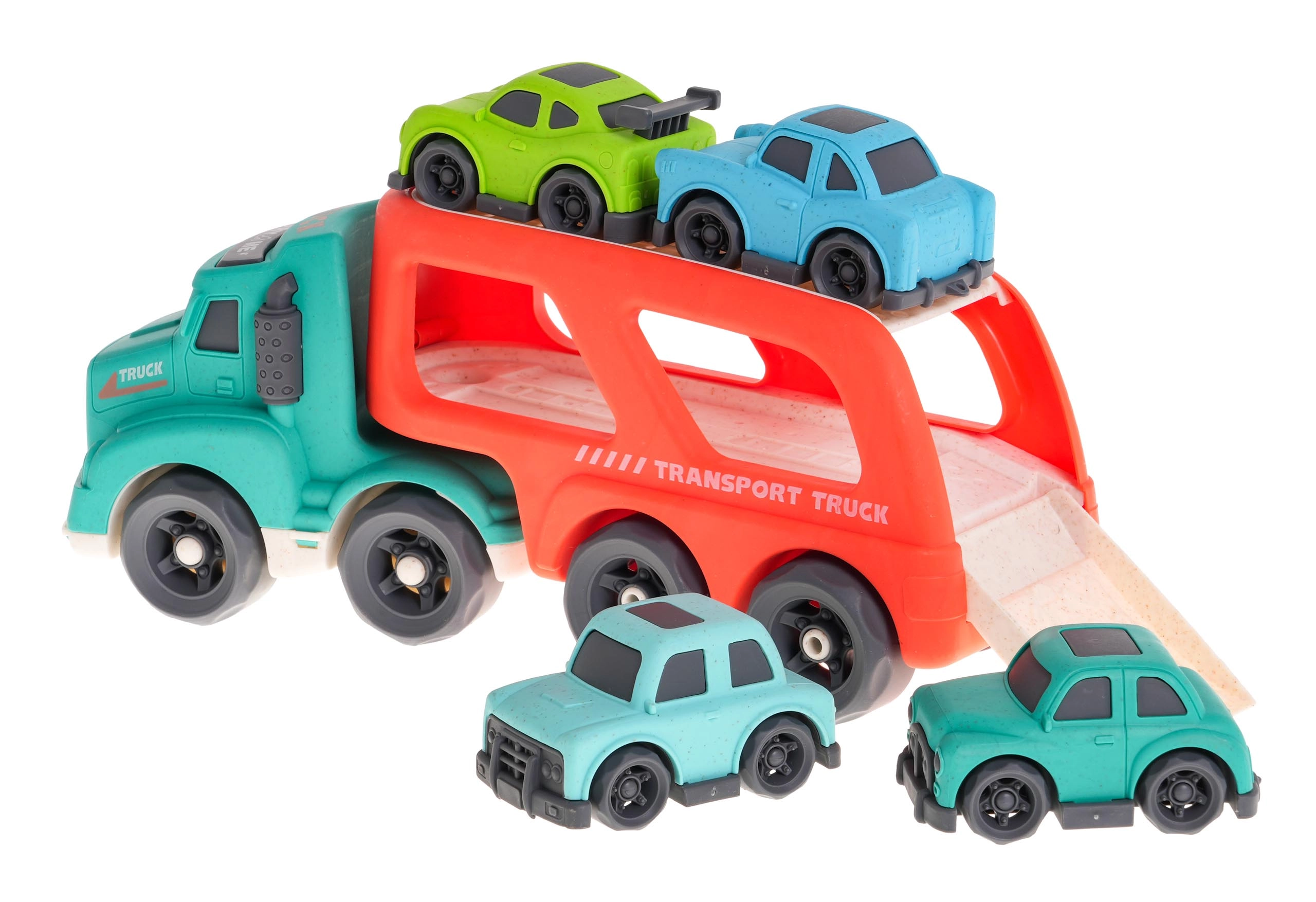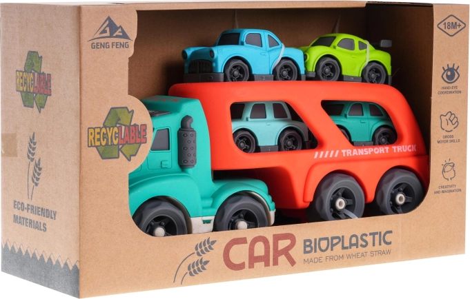 Pakkens indhold: trækvogn med platform i bioplast, 4 små biler, batterier 3× LR44.