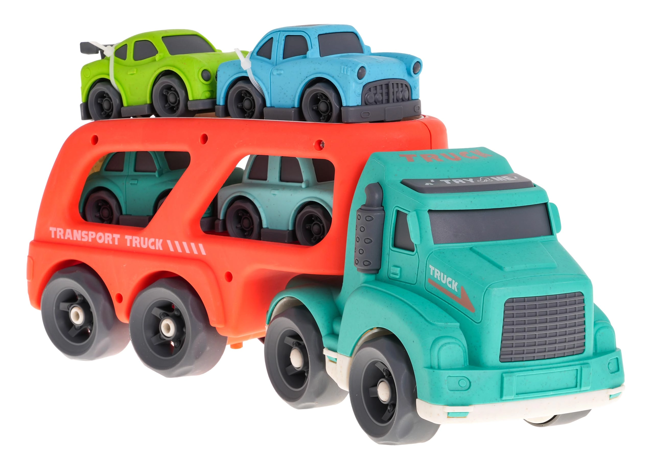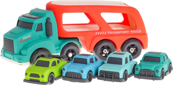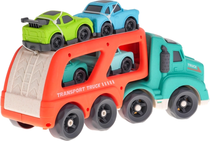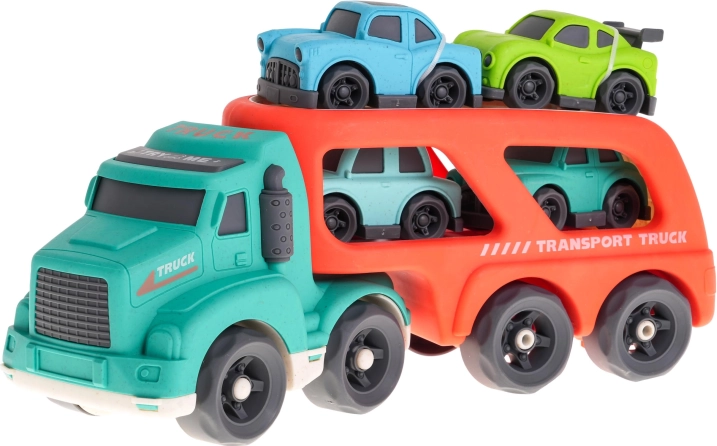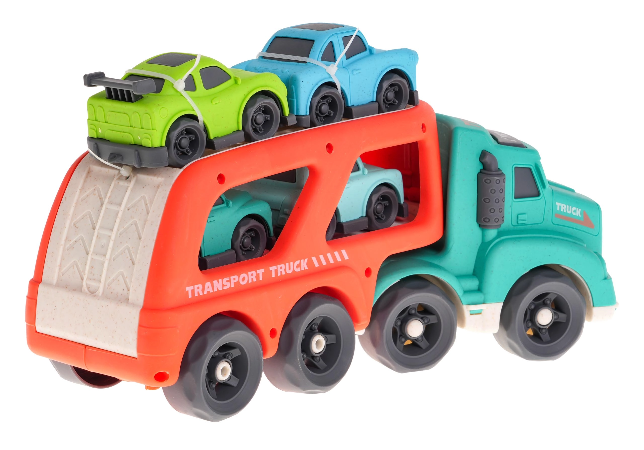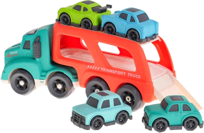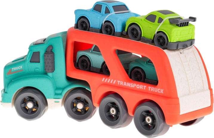 Denne farverige transportlastbil med platform og 4 små biler stimulerer fantasi og finmotorik. Den aftagelige platform, hjul der ruller let, samt attraktive lys- og lydeffekter sikrer mange timers leg. Bioplast skåner miljøet og er samtidig robust og let at vedligeholde.