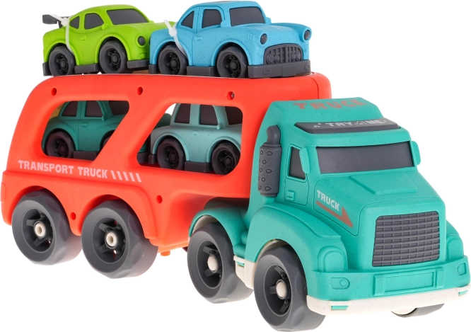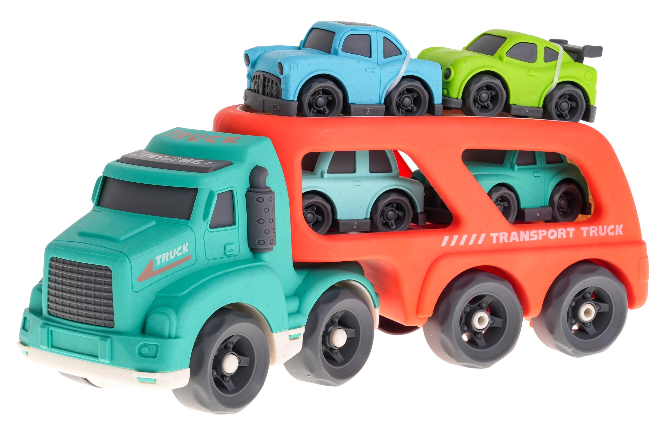 Transporteren kan nemt afkobles og bruges separat. Med fire farverige små biler for varieret leg.