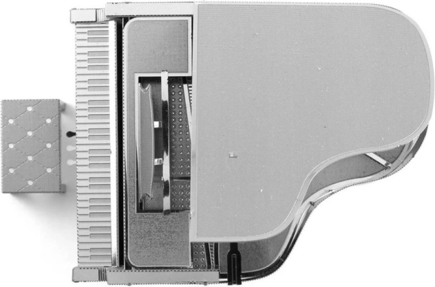 Lasergraverede dele gengiver troværdigt klaviatur, pedaler og klaverets overflade for et ekstra realistisk udseende.