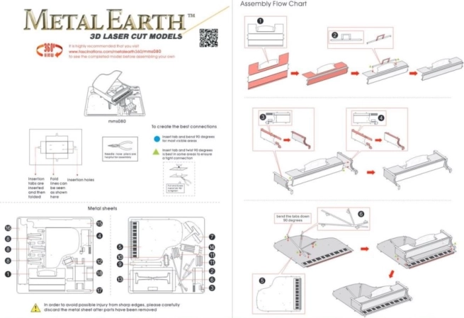 Det færdige klaver på cirka 7,5 × 6,8 × 5,9 cm bliver en markant dekoration derhjemme, på kontoret eller i skolens montre. Pakken indeholder 2 stålark og en illustreret vejledning; til montering anbefaler vi små sidebidetænger og fine fladtænger (medfølger ikke).
