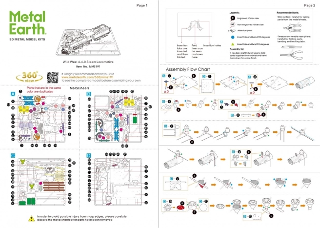 En spændende udfordring, en oplevelse under samlingen og et strålende resultat – det er METAL EARTH-modeller! Model fra kollektionen Wild West til alle fans af Det Vilde Vesten! At bygge METAL EARTH 3D-puslespil kræver tålmodighed og dygtige hænder. Resultatet opvejer dog fuldt ud den indsats, der lægges i det! De miniaturekopier er en særlig iøjnefaldende og fængslende dekoration ikke kun derhjemme, men også på kontoret eller i skolen. Af kvadratiske plader af stål (11 x 11 cm) vokser en detaljeret, fascinerende model frem under dine hænder. Det autentiske udseende af METAL EARTH 3D-puslespil opnås takket være detaljeret lasergravering. Pakken indeholder 4 stålplader og en samlevejledning. Værktøj er ikke inkluderet. ARBEJDSPROCES: Tag de enkelte dele ud af metalpladerne, og brug om nødvendigt små bidetænger (medfølger ikke). Delene samles ved hjælp af låse bestående af en tap og et hul. Bøj tappen med små, tynde tænger (medfølger ikke), og forbind gradvist alle låse, indtil et meget realistisk mesterstykke opstår! Anbefalet alder: fra 14 år.