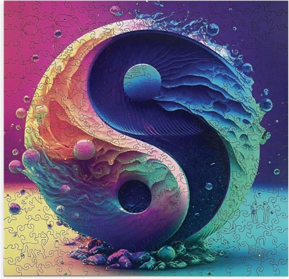 Puslespillet imponerer med et moderne og farverigt Yin Yang-motiv, der symboliserer balance og harmoni. Overgangene fra turkis til lilla er en forfriskende oplevelse for øjnene.
