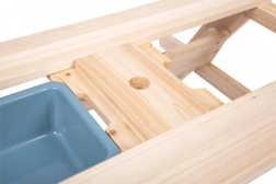 Børne træbord 2-i-1 er det ideelle supplement til haven, terrassen eller altanen, hvor børn kan nyde udendørs leg. Bordet er lavet af massivt træ, der er vejrbestandigt, hvilket sikrer lang levetid. Det har to aftagelige plastbakker med en kapacitet på 3 liter, der er velegnede til at blande materialer eller opbevare legetøj til sand.