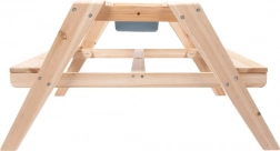 Træbordet fungerer som et picnicbord og et legeområde med bakker til sand eller vand.