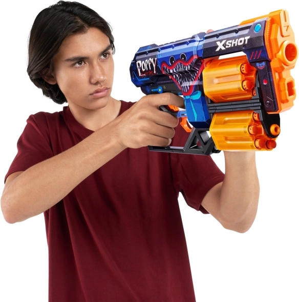Blasteren X-SHOT Skins Dread Jumpscare leverer maksimal underholdning. Den lette og holdbare konstruktion, den markante grafik og den intuitive ladning gør denne pistol til et ideelt valg til hurtige opgør både hjemme og ude. Den roterende tromle muliggør jævn affyring af pile i træk og sikrer det tempo, du sætter.