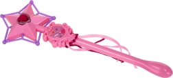 Lyserød tryllestav med stjernespids, udsmykket med lilla perler og en rød sten i midten. Staven har lange bånd og bringer en magisk oplevelse til enhver leg.