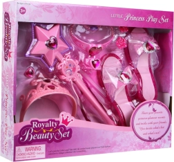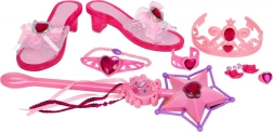 Indeholder tiara, armbånd, ring, øreringe og en magisk tryllestav. Alle dele er dekoreret med røde hjerte-smykker, ideelle til fantasifuld leg.