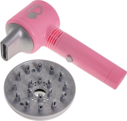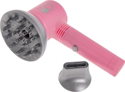 Børnesættet med frisørredskaber inkluderer alt, hvad en lille frisør har brug for til sine første forsøg på hårstyling. Hårtørreren drives af batterier og tilbyder en mild luftstrøm, der autentisk simulerer ægte hårtørring. Den er også udstyret med to udskiftelige mundstykker - diffuser og koncentrator.