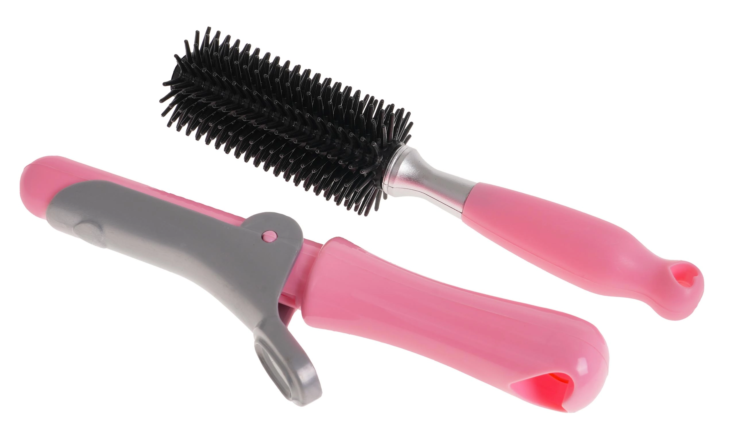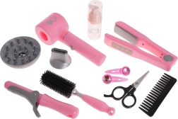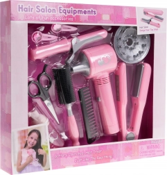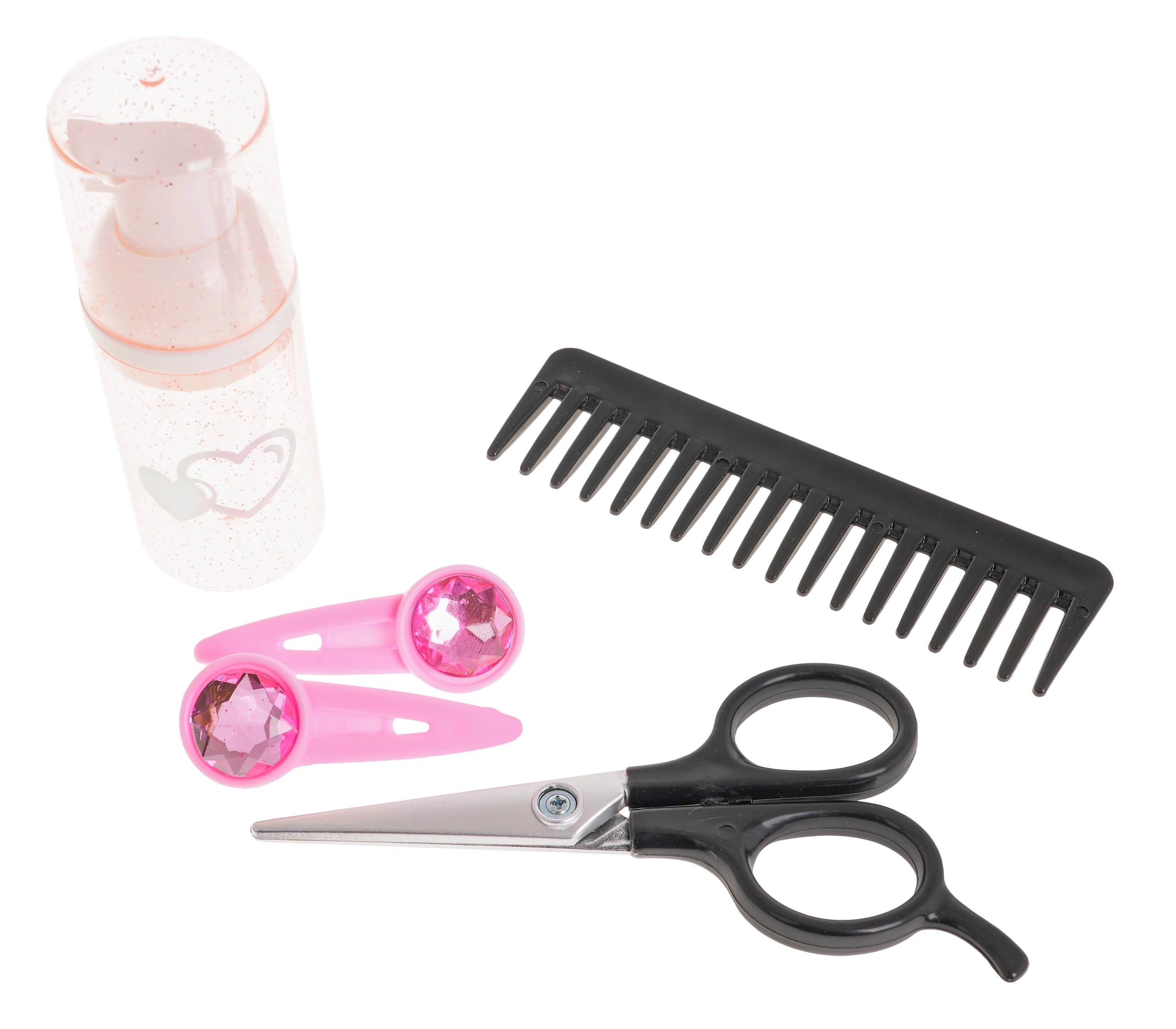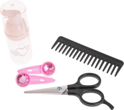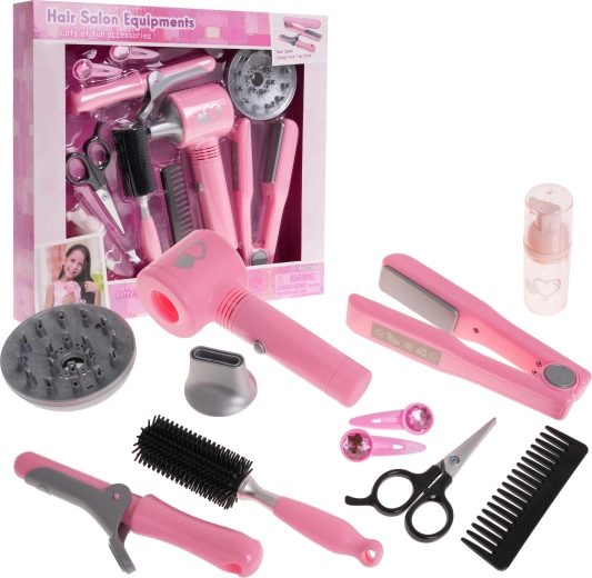 Sættet inkluderer også en krøllejern og glattejern, kam, børste, saks, flaske og hårklemmer, hvilket giver alt nødvendigt til kreativ leg.