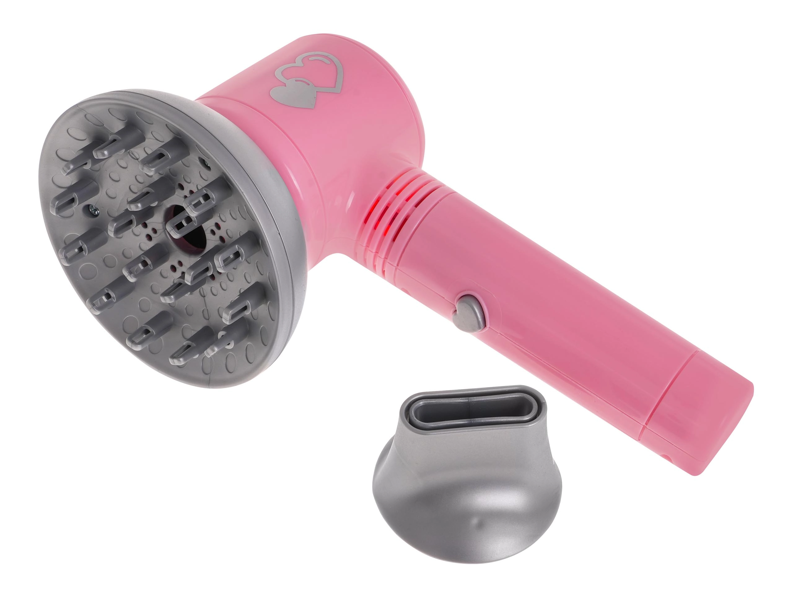 Hårtørreren kører på batterier og tilbyder en realistisk oplevelse af hårtørring takket være lydeffekter og let luftstrøm.