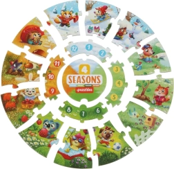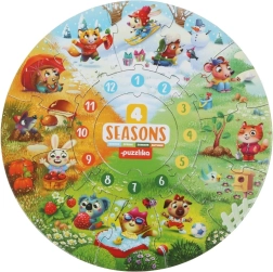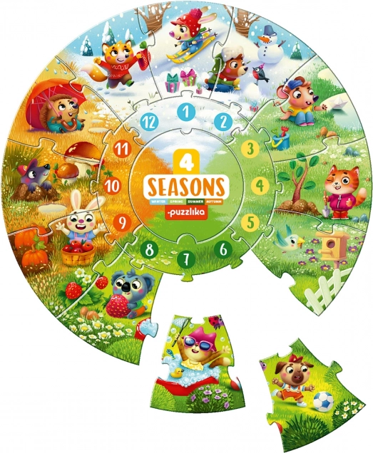 Puslespillet Fire Årstider fra mærket Puzzlika imponerer med sit moderne, kreative design og er beregnet til børn fra 2 år. Sammenlagt udgør puslespillet et stort rundt billede med en diameter på 28 cm, hvor udendørs aktiviteter karakteristiske for de enkelte årstider er afbildet. Dette pædagogiske spil hjælper børn med at udvikle logisk tænkning, fantasi og finmotorik.