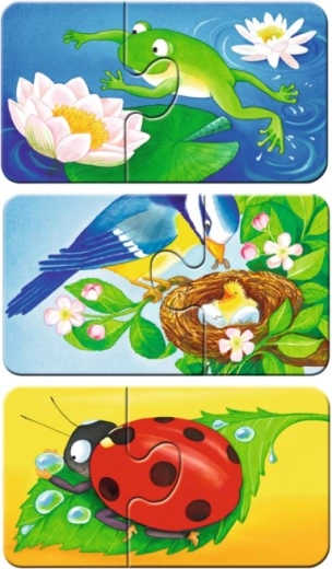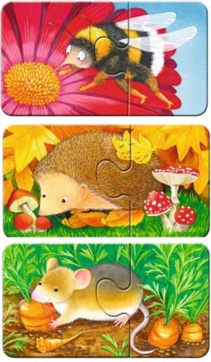 Topunkts puslespil med smukke billeder, specielt skabt til de mindste børn. De robuste, solide brikker er lavet af ekstra kraftig karton og hjælper børn med at udvikle motorik, koncentration og fantasi. Blandt de ni motiver finder du populære dyr, du kan møde i haven og omegn: sommerfugl, pindsvin, mariehøne og flere andre.