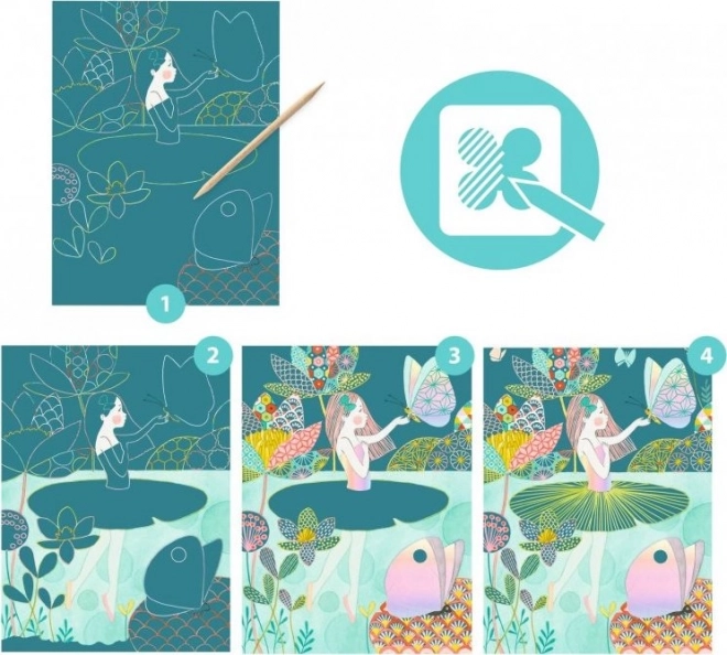 Oplev skaberglæde med sættet af ridse-tegninger fra DJECO. Når du forsigtigt skraber det øverste lag væk, afsløres en smuk sø-nymfe og hendes venner. Sættet er ideelt til kreativ afslapning og finmotorisk udvikling og vil glæde både børn og voksne.