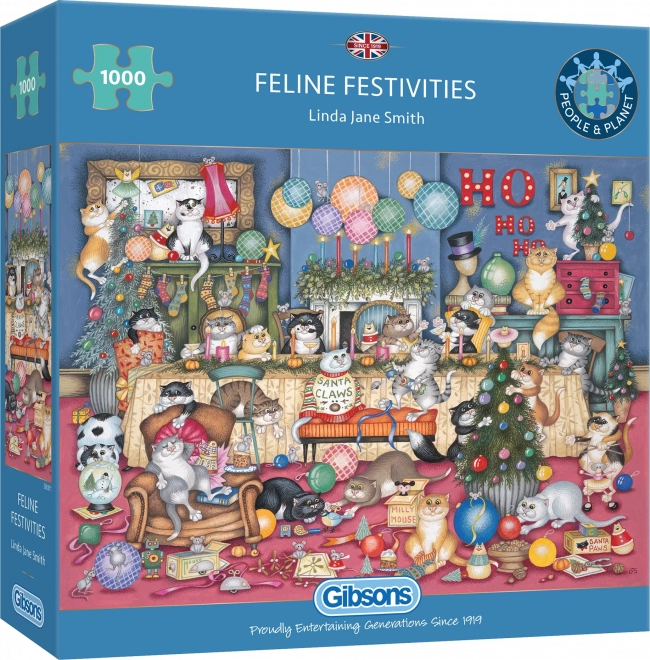 GIBSONS Puslespil Kattens festligheder vil glæde enhver katteelsker. Puslespillet indeholder 1000 brikker, som tilsammen skaber en betagende katte-scene.