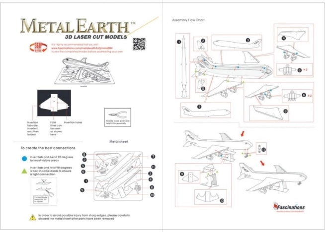 Fjern de enkelte dele fra metalpladerne; brug om nødvendigt en lille bidetang (medfølger ikke). Delene forbindes ved hjælp af låse bestående af en tap og et hul. Bøj tappen med en lille spidstang (medfølger ikke), og forbind gradvist alle låse, indtil der opstår et meget realistisk mesterværk!