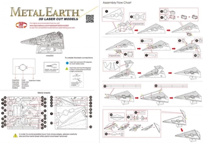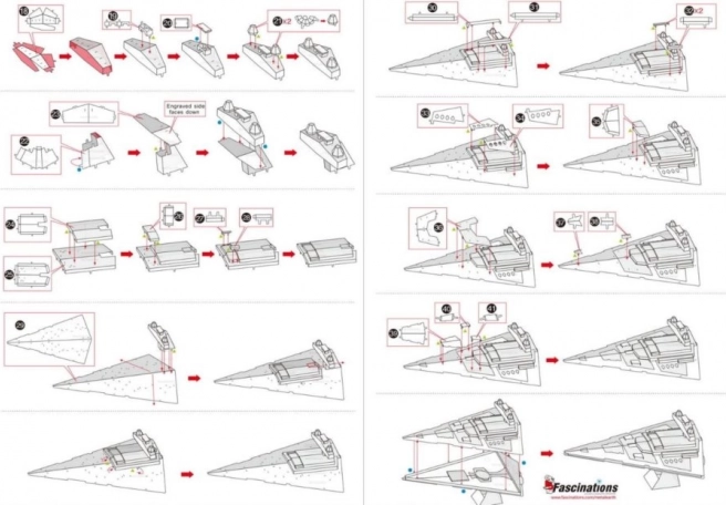 Fjern de enkelte dele fra metalpladerne; brug om nødvendigt små bidetænger (medfølger ikke). Delene samles ved hjælp af låse bestående af en tap (krog) og et hul. Bøj tappen med små, spidse tænger (medfølger ikke), og forbind gradvist alle låse, indtil der opstår et meget realistisk mesterværk!