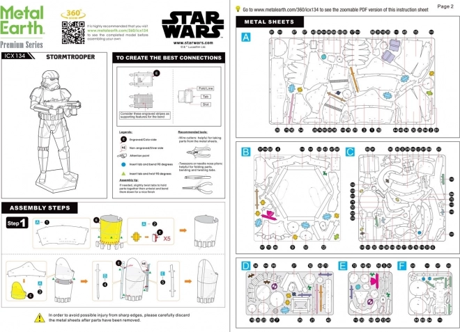 Pakken indeholder tre metalplader med udstansede dele, en pincet og en detaljeret samlevejledning. Brug tapper til at forbinde delene samt en tynd tang (medfølger ikke).
