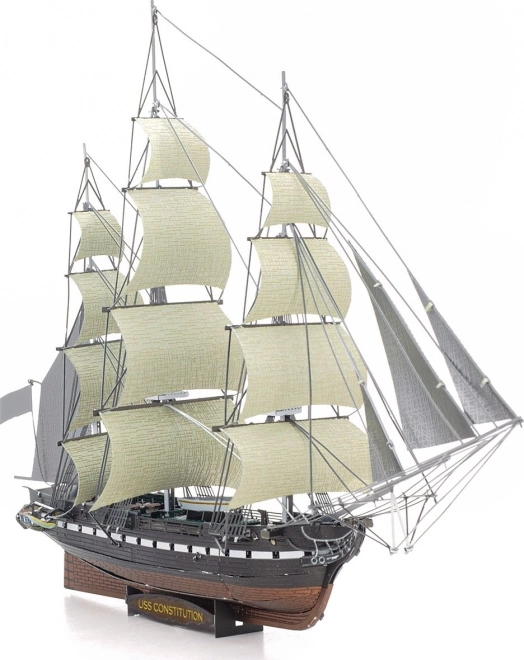 Den færdige model fremhæves på et stativ med betegnelsen USS Constitution – ideel til montre, kontor eller samling.